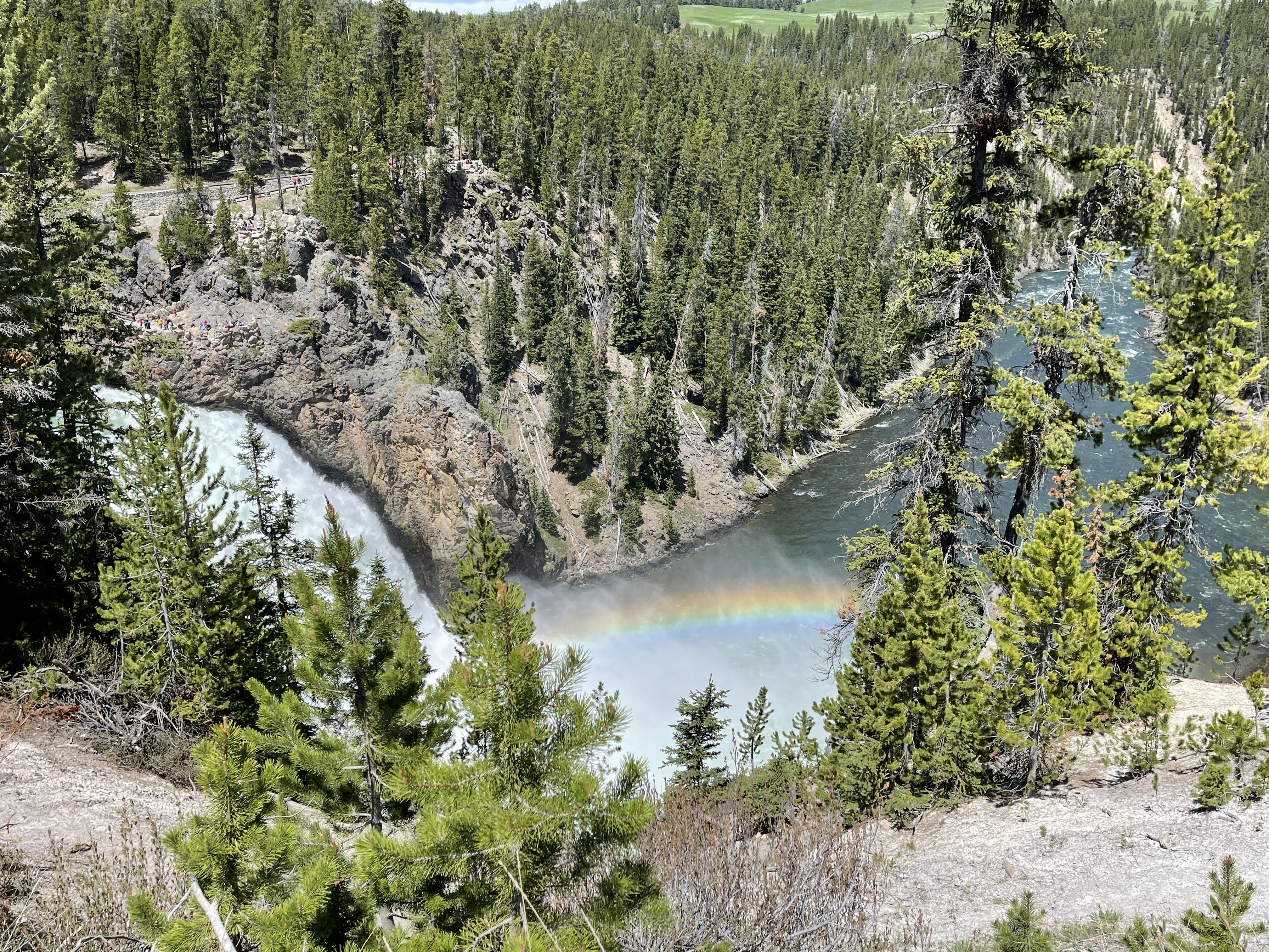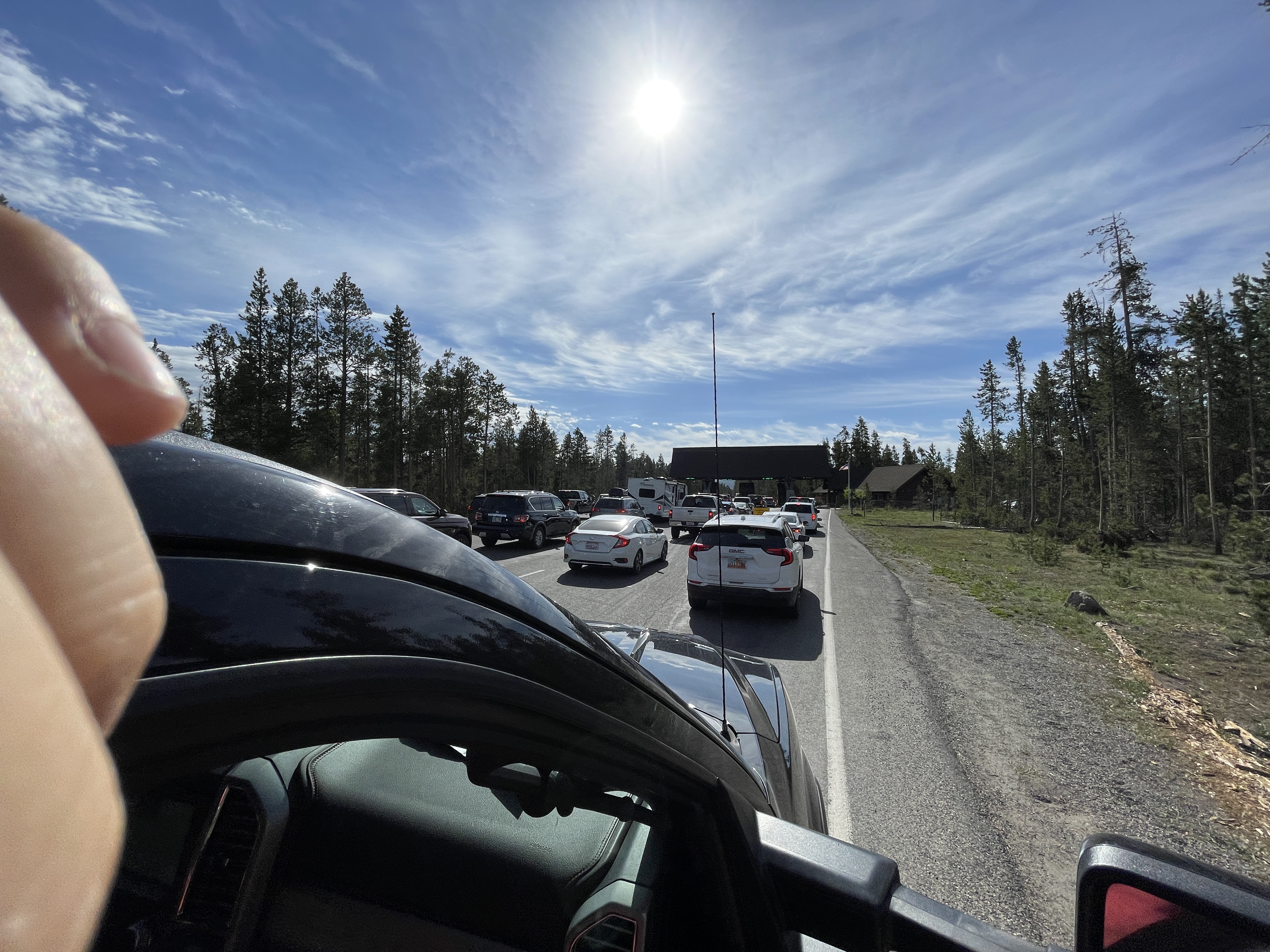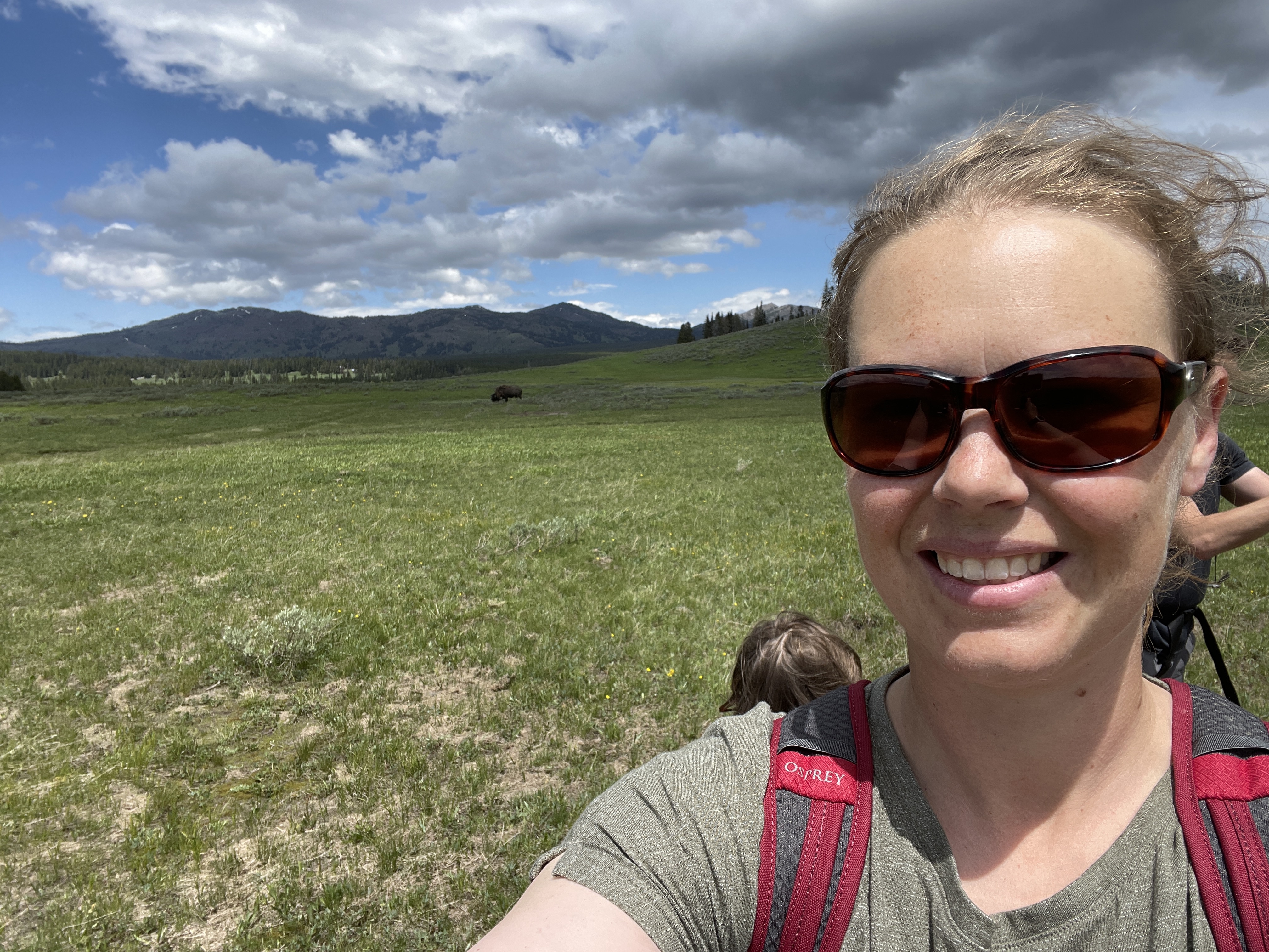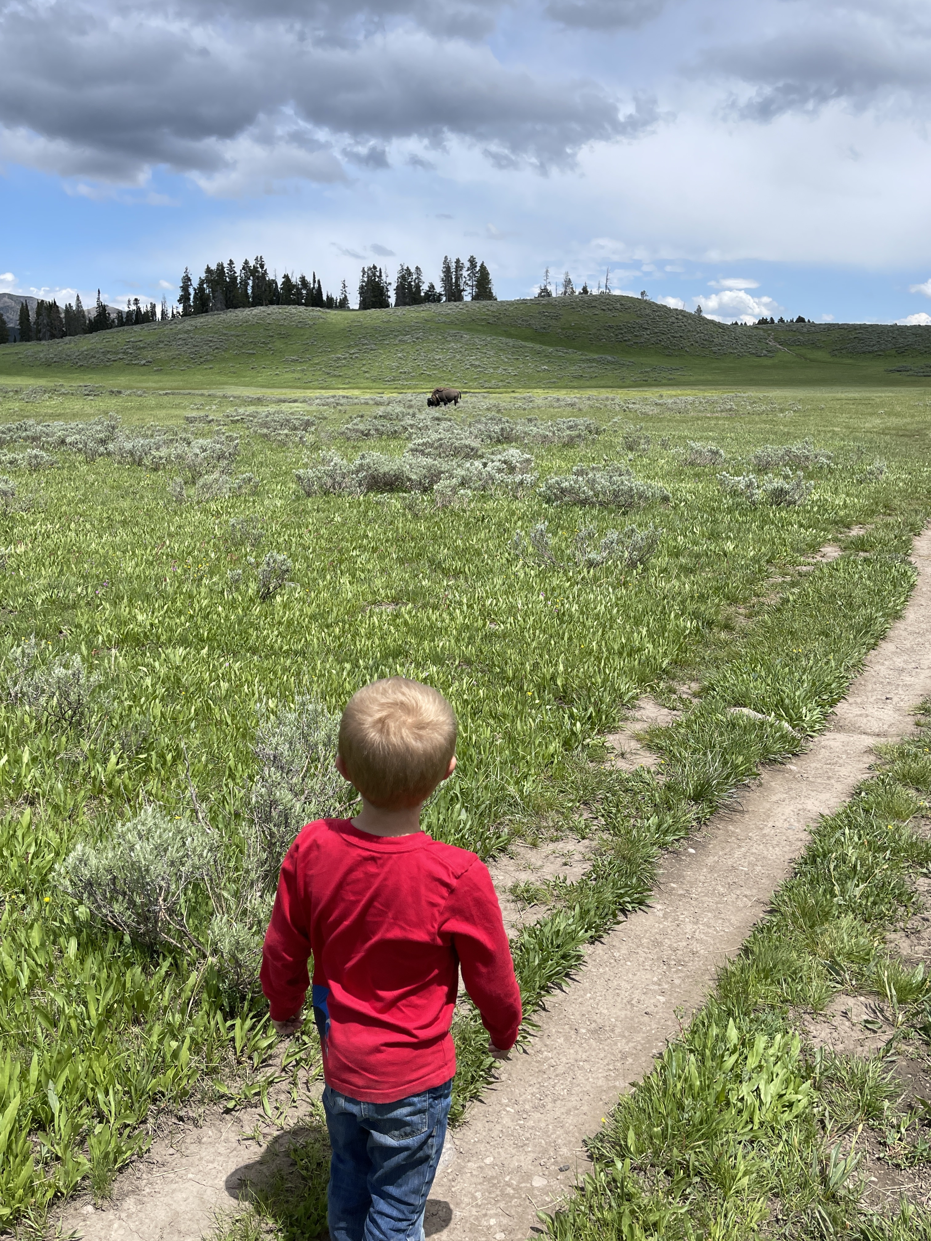 We actually set the alarm clock so that we could wake up and get into the Park. For those of you possibly traveling to Yellowstone this summer you only need your regular National Parks Pass or a day ticket. There are no special tickets and at this time they are not limiting entry. With that being said you will hit traffic. It took us about 2 hours from the west entrance to Canyon Village which is around 35 miles. We headed into the Village first and grabbed lunch and souvenirs. Next stop was the Upper Falls trail. Well we missed the turn to the first entrance and ended up driving to the viewpoint and parking there. We were now in the middle of the trail I wanted to take🤦🏼♀️. What to do now? Well we rolled with it! The waterfall was amazing! I definitely need to get out my thesaurus out to find more words for beautiful🤣 From the overlook we were pretty far away but could still feel the mist on our face! We decided to start the trail going south to get a better view or the river and falls. It was a relatively easy half mile but when we got to the end we had the choice to turn around and head back to the truck or take the 1.2 mile trail to Clear Lake and then .7 back to the truck. The theme of our trip is “adventure awaits” so that is what we did went on an adventure! An adventure it was, instead of being in the dense woods next to a river we were on hilly plains of Yellowstone, where the bison roam. Adam I were on alert but still enjoying the vast beauty of the park. Sure enough about half way to the lake we came up on a bison hanging out about 20-25 feet from the trail. Being as careful as we could we went off the trail a bit to give the bison a wide berth so that we would not scare it. It was pretty awesome! A little after that the whining began, this time it was both the kids but we pushed forward without briber this time. We made it to Clear Lake, another hidden wonder off the beaten path in Yellowstone! We rested up for a little bit but decided to head back after the smell of sulfur or something else, we aren’t quite sure, became too much for my senses. Thankfully the hike back to the truck was less than a mile and I carried Davis for about half of it. That is what happens when you take a hike during nap time. We got back to the truck and powered up with a quick snack and hopped back in the truck to explore the rest of the park. We stopped and walked the boardwalk at the Mud Volcano and Sulphur Cauldron. Then got back in the truck and headed to Yellowstone Lake. Fun fact this lake has the highest surface elevation of 7733ft in the lower 48. Adam and I only got out at this stop and took pictures quickly because the wind and rain were rolling in. Josey and Davis finally decided to close their eyes and take a nap🙌🏼 so the next miles of the park were peaceful. We passed the Continental Divide marker at 8391ft and 8262 ft. Adam and I hopped out again for a quick pic at the Kepler Cascades and then we headed to the Grand Prismatic Spring. Last minute we decided to swing the Old Faithful Village but decided to not get out because it was a little bit of a hike to see the geyser and the kids were still sleeping. We kept driving to the Midway Geyser Basin and this was the first place we were met with heavy park traffic at a point of interest. I really didn’t want to leave Yellowstone with out getting a glimpse. Adam got in the long line of cars waiting to park and I jumped out a ran to the boardwalk. I explored as quickly as I could with the boardwalk full of people. It was SUPER windy! You could see people’s hats stuck in areas we aren’t supposed to walk because they had been blown off. The Spring was amazing, well what I could see of it when the wind blew the steam away. The colors were so vibrant! Definitely a unique feature to Yellowstone and I’m so happy I got a chance to see it even if it was brief. I headed back out to find Adam, who unfortunately I just missed so I had to walk all the way back to the main road to find him. Thankfully we were able to turn around and not get stuck in the line again. After that our trip to Yellowstone was over! We drove the whole of Grand Loop Rd. We could have easily spent a week at the park exploring but alas we had to head back to the camper for dinner and bed. The last excitement for the evening was be able to feed the campground horses that were right behind our camper. The kids loved it and I have to admit I did too❤️. I am so grateful that we have been able to explore with our camper and we have many more adventures to come!